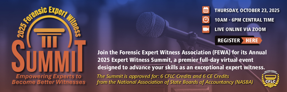 Join the Forensic Expert Witness Association (FEWA) for its Annual 2025 Expert Witness Summit, a premier full-day virtual event designed to advance your skills as an exceptional expert witness. Gain cutting-edge insights and practical strategies from leading professionals in the field. Enjoy networking opportunities with top-tier expert witnesses from diverse disciplines across the nation with the convenience of attending from your own computer, saving time and travel costs. Click here for more information. FEWA Member Spotlight