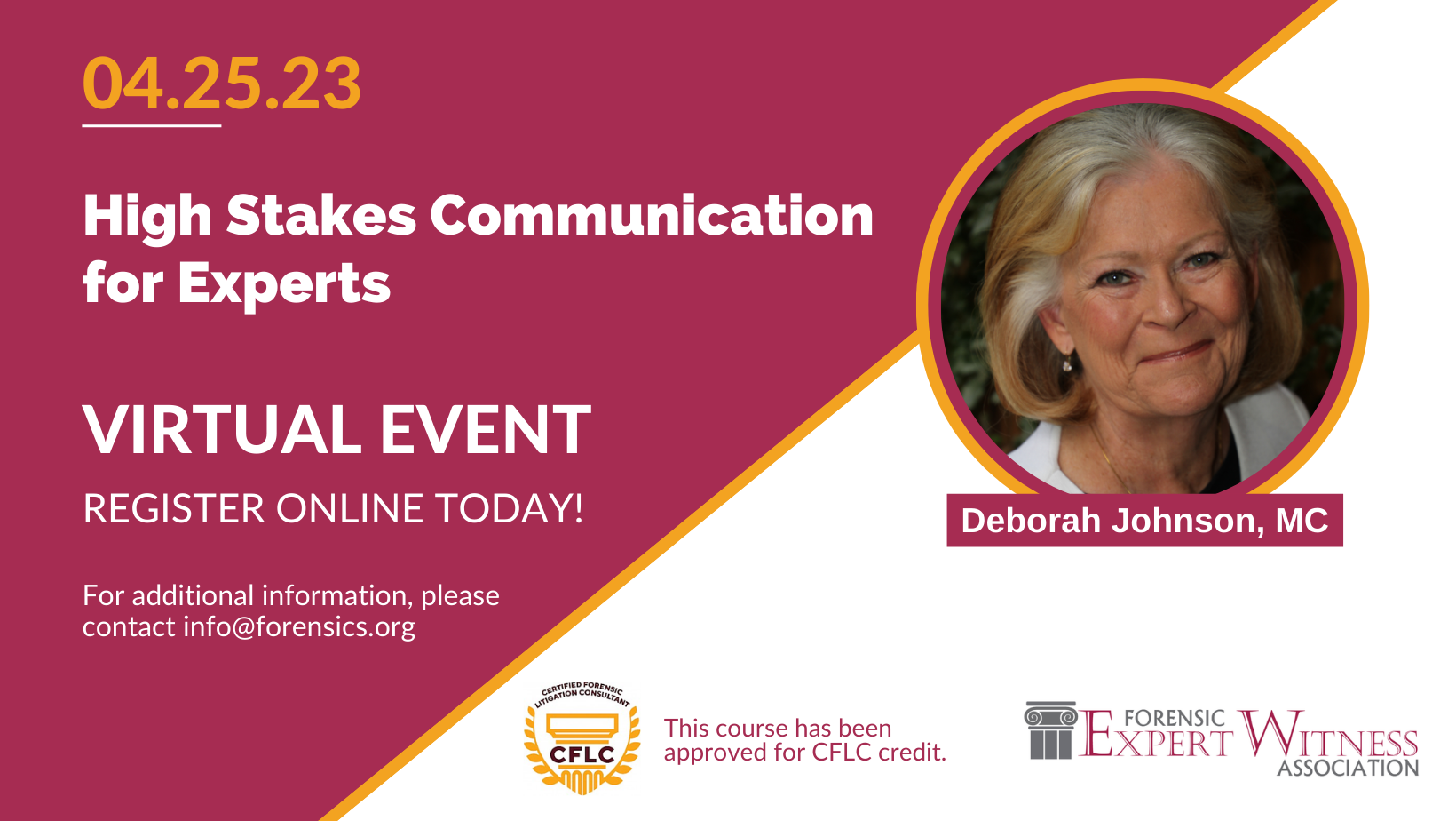 Date: April 25 at 2:30 – 3:20 p.m. PT Speaker: Deborah Johnson, MC You’re an experienced expert with a rich background. You’re working on a solid case, and you’ve written a strong report. Now it’s time to testify. Savvy opposing counsel has you in their sights and is stalking you like a cheetah taking down a gazelle. They know the four secret triggers to hijack your brain and get you to melt down within minutes, abandoning your well-thought-out testimony. Registration Link: https://forensic.org/events/EventDetails.aspx?id=1694562&group= FEWA Member Spotlight