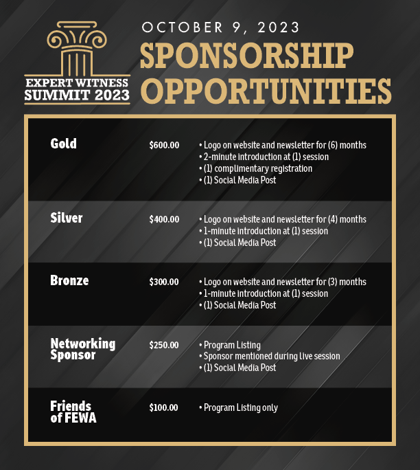 Did you attend the FEWA National Conference? Conference attendees earned up to 13.5 educational credits towards the Certified Forensic Litigation Consultant (CFLC Credential). FEWA Professional and Professional Consulting members are eligible to apply for the CFLC. Do you qualify for the CFLC? Learn more about the application requirements. |