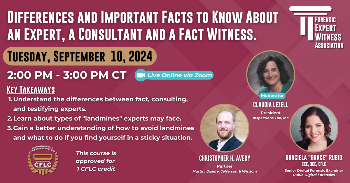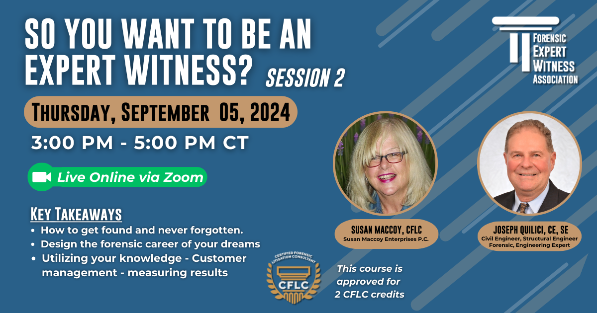 Did you attend the FEWA National Conference or the FEWA Expert Summit? Conference and Summit attendees earned up to six educational credits for each event towards the Certified Forensic Litigation Consultant (CFLC) credential. FEWA Professional and Professional Consulting members are eligible to apply for the CFLC. Do you qualify for the CFLC? Learn more about the application requirements. |