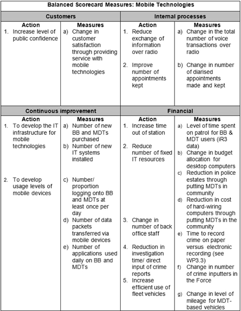 Planning and asking questions are ways to start. When investigating any new technology, strategy should guide governance, which in turn should guide projects. In IT, we should have a strategy that aligns with the overall organization’s strategy. This, in theory, would align with the police department’s strategy as well. The ideal method would be a holistic approach. One recommendation in my research is to pull historical statistics and conduct surveys on various attributes to create a balanced scorecard (Lindsay, 2012, p. 313). While this would be ideal, in many cases it may not be practical without resources and the complete support of the police department to carry out the research. However, I did attach a sample balanced scorecard for mobile technology as Appendix A for those interested.