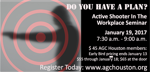 January 9-12: OSHA 500: Trainer Course in OSHA Standards for Construction January 16-19: OSHA 510: Occupational Safety and Health Standards for Construction January 16-26: OSHA 510: Occupational Safety and Health Standards for Construction - EVENING January 17-20: OSHA 2045: Machinery and Machine Guarding Standards January 23-26: OSHA 511: Occupational Safety and Health Standards for General Industry January 30-February 1: OSHA 502: Update for Construction Industry Outreach Trainers January 30-February 2: OSHA 2015: Hazardous Materials February 2-3: OSHA 10-Hour Safety Course For Entry Level Construction Workers The Leading Edge is a bimonthly newsletter dedicated to updating AGC Houston members about safety issues in the commercial construction industry.