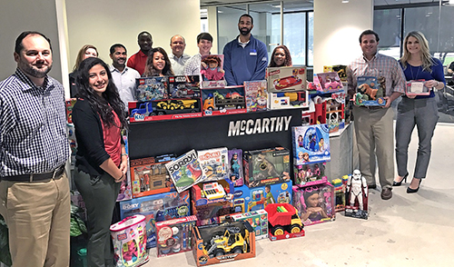 Employees of McCarthy Building Company took part in Operation Stocking Stuffer, a toy drive for local underprivileged children sponsored by The Houston Fire Department and KPRC Local 2. This year, company's commercial construction group and Civil group donated 105 toys, topping out last year's total of 64 toys. This was McCarthy's third year of participating in the Operation Stocking Stuffer program.