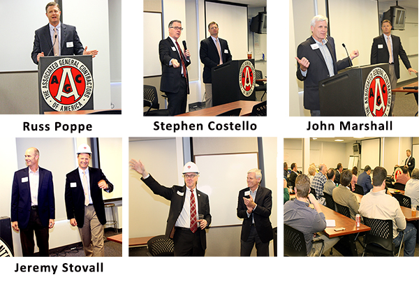 On Friday, November 10, 2017, AGC Houston hosted Russ Poppe, Executive Director, Harris County Flood Control District and Stephen Costello, Chief Resilience Officer, City of Houston, for an interesting discussion on what they are doing to make significant investments in flood mitigation. The City and County are working together with state and federal entities on the complex issues facing the region such as regulatory and budget constraints, aging infrastructure and technology shortfalls. At the end of the program, Government Affairs Committee Co-Chairs John Marshall, Satterfield & Pontikes Construction, Inc., and Jeremy Stovall, Brookstone, LP, presented each speaker with an AGC Houston hard hat. We look forward to inviting our guests back for a progress update next year.