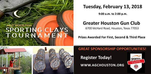 February 13: AGC Advocacy Sporting Clays Tournament February 15: AGC Membership Orientation March 1: AGC Membership Mixer - NEW LOCATION! Details Coming Soon March 23 & 24: AGC Houston Barbecue Cook-Off & Fair ![]() Whether you are a novice or a seasoned enthusiast, enjoy a morning of shooting fun and your chance to win some great prizes! Sponsorship, Raffle & Registration Details here. News you can Use