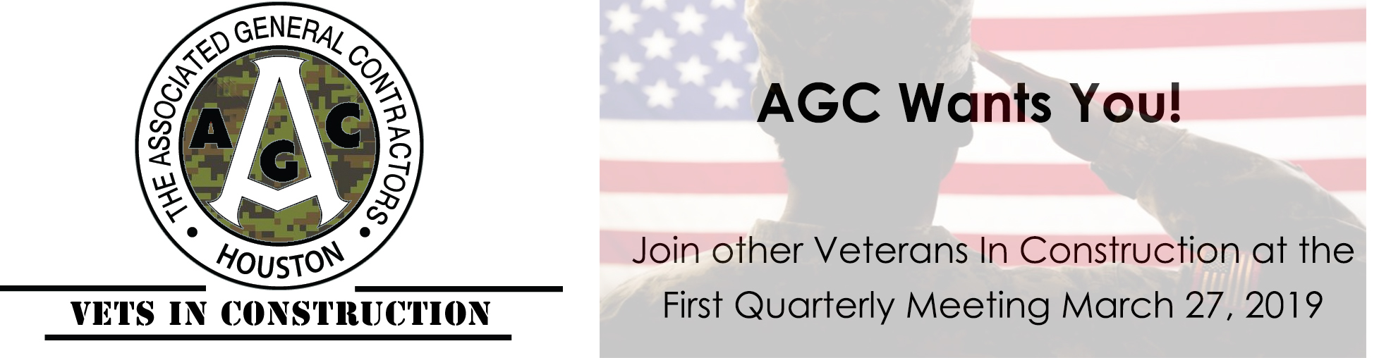 QUARTERLY MEETING - March 27 - 8-10 a.m. At AGC Houston Please join your fellow veterans for a unique opportunity to discuss benefits! Extended service opportunities; Home/land loan process; Funeral benefit process; Legal benefits; Service officer meet/greet; State/federal benefit information RSVP to Kim Mason, kim.m@agchouston.org