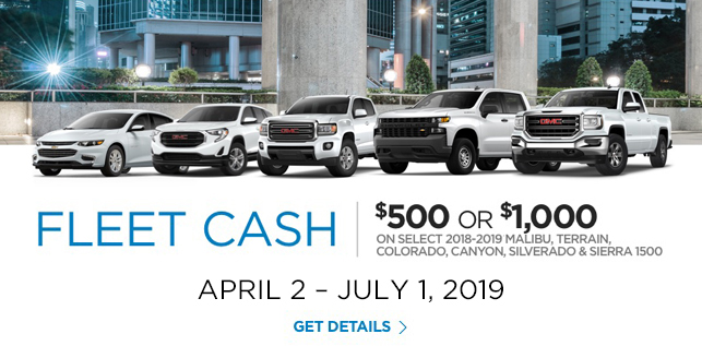 Fleet customers purchasing from dealer inventory can receive $500 in Fleet Cash, which can be combined with the National Fleet Purchase Program for Stock Units (FQV), Association Cash and Business Choice Offers on qualifying vehicles. Separately, receive $1,000 in Fleet Cash on 2018 and 2019 Chevrolet Silverado LD Light Duty Pickups (K2) and 2018 and 2019 GMC Sierra Limited Light Duty Pickups (K2). Please visit any local GM Dealership for details. Here's Looking at You
