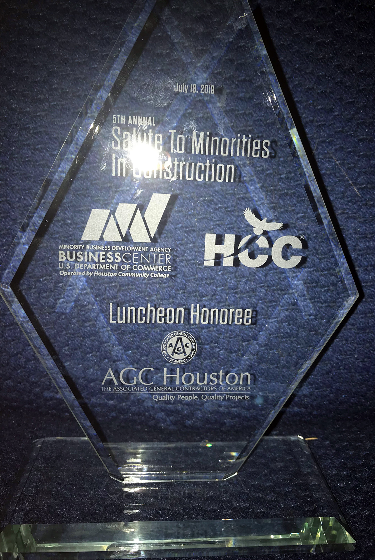 On July 18, Jerry Nevlud, AGC Houston President/CEO, and the AGC Diversity Committee were recognized at the HCC MBDA Business Center's Salute to Minority Contractors Luncheon. Congratulations to Jerry on this honor and to the AGC Houston members who support our efforts through the Diversity Committee! Quick Links