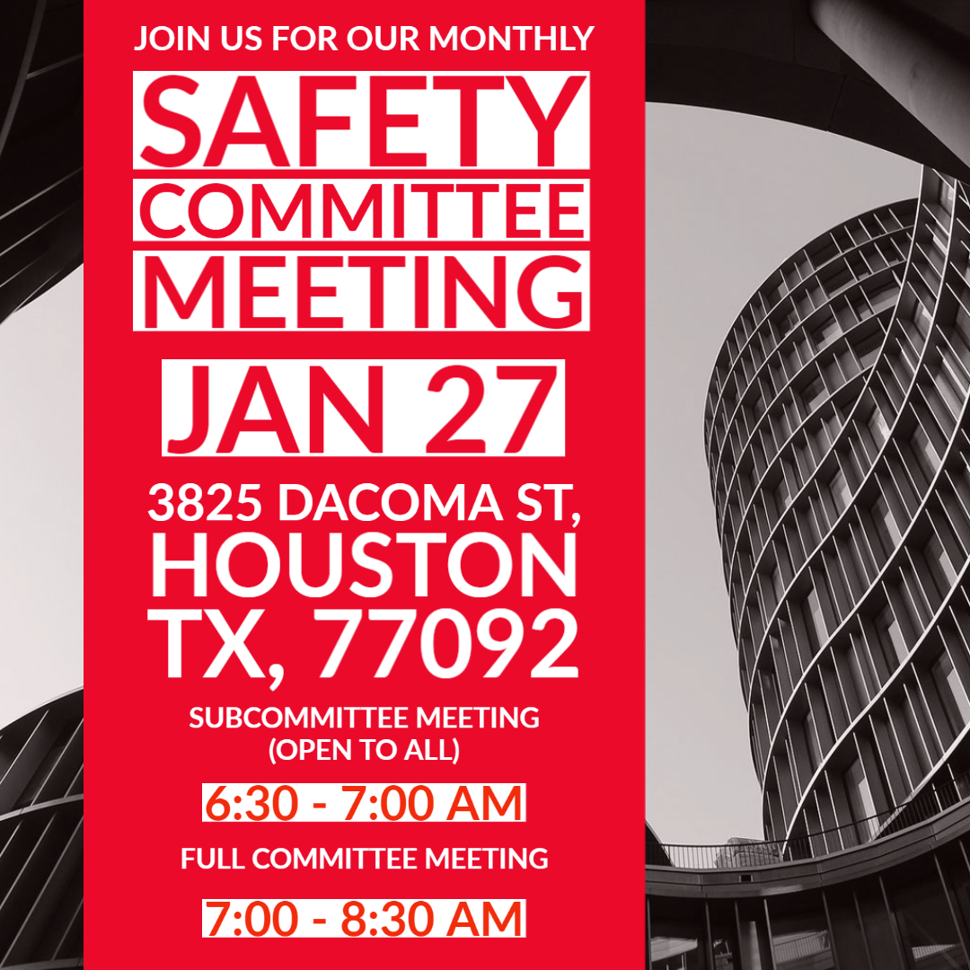 This is just a friendly reminder that the AGC Houston Safety Committee will NOT be meeting tomorrow, October 28, 2022. Meetings will resume January 27, 2023. Enjoy the holidays!