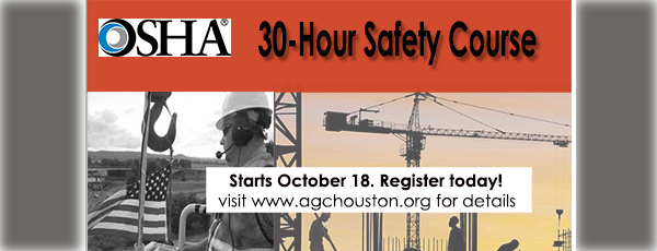 October 9-12: OSHA 510: Occupational Safety & Health Standards for Construction October 10-12: OSHA 2264: Permit-Required Confined Space Entry October 10-13: ATP 191: Safety and Health Authorized Trainer October 16-19: OSHA 501 Trainer Course in OSHA Standards for General Industry October 18-Nov.15: OSHA 30-Hour Course October 23-26: OSHA 500: Trainer Course in OSHA Standards For Construction October 27: AGC Houston Safety Committee Visit https://www.naylornetwork.com/hca-nwl/articles/index-v2.asp?aid=464906&issueID=56225 to view the full article online. Hurricane Harvey Related News