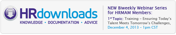 Need a better system of coordinating training needs in your organization? Employee education and refresher training programs can be time consuming and tedious to manage. In this Webinar you will discover the importance of assessing training needs, the benefits of various delivery methods and how to manage distribution. Find out more during the first in a new bi-weekly Webinar series presented by HRdownloads. It's exclusive to HRMAM members at a discounted rate of $39.00 per Webinar. HRMAM is pleased to welcome Lianne Gallie, BA., CHRP, your HRdownloads' Webinar host for the first of this new series beginning December 4th, 2013 at 1pm CST. Click HERE to register online.