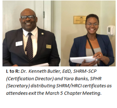 March Chapter Meeting (3/5/2020). L to R: Ana Grogan, SHRM-CP (Workforce Readiness Director), and Heather Cosgrove, SHRM-SCP, SPHR (President-Elect)