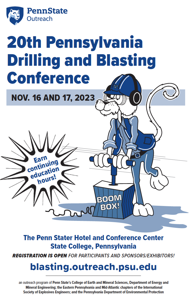 7th Annual Australian Chapter Conference November 8 - 9, 2023 The Star Gold Coast, Queensland, Australia www.iseeaustralia.org 20th Annual Pennsylvania Drilling & Blasting Conference November 16 & 17, 2023 Penn Stater Hotel & Conference Center State College, Pennsylvania https://blasting.outreach.psu.edu
