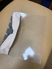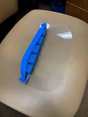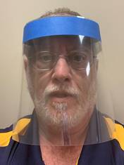 The right side face shield is made of ½ of a laminating pouch – run through the laminator, a backer foam sweatband, and ACE type bandage material. Cost to construct is approximately $0.90