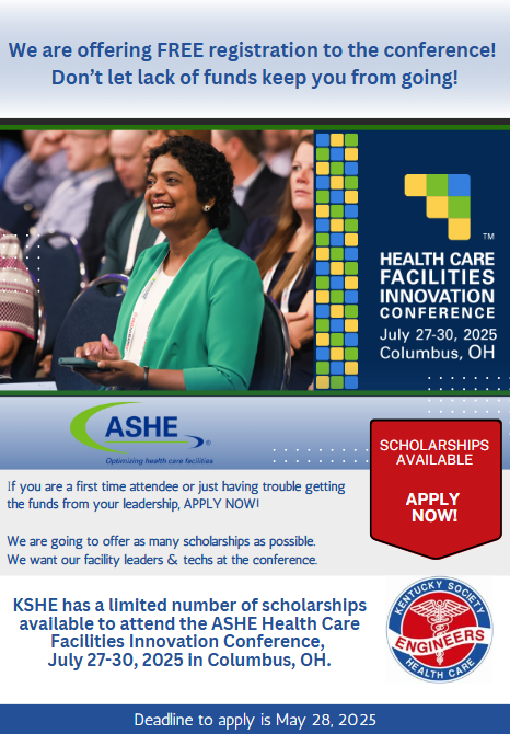 The Kentucky Society of Healthcare Engineers (KSHE) is thrilled to announce that we will be providing free transportation as well as registration and housing scholarships for select applicants from Kentucky to the 2025 ASHE Healthcare Innovation Conference (HFIC) in Columbus, Ohio! With the HFIC being held right next door in Columbus, we want to make it as easy as possible for our members to attend this invaluable event. This is a fantastic opportunity to network with industry leaders, learn about the latest innovations in healthcare engineering, and represent the Commonwealth on a national stage. KSHE is incredibly grateful to Thermal Equipment/Bluegrass Hydronics for their generous sponsorship, making the free transportation possible! Their commitment to supporting KSHE and the advancement of healthcare engineering in Kentucky is truly appreciated. To apply, please submit your application using this form: https://app.smartsheet.com/b/form/6b2f182a8a9546489f88f765ab152dc6 We will be awarding registration and housing scholarships to HFIC using this application as well. Bus transportation will have stops in Louisville and Lexington on the way to Columbus. Stay tuned for more details regarding departure locations, times, and registration information. We will be releasing these details soon, so keep an eye on your email and the KSHE website. The deadline to apply is May 28, so don't miss out on this incredible opportunity to attend the 2025 ASHE HFIC with free transportation courtesy of KSHE and Thermal Equipment/Bluegrass Hydronics!