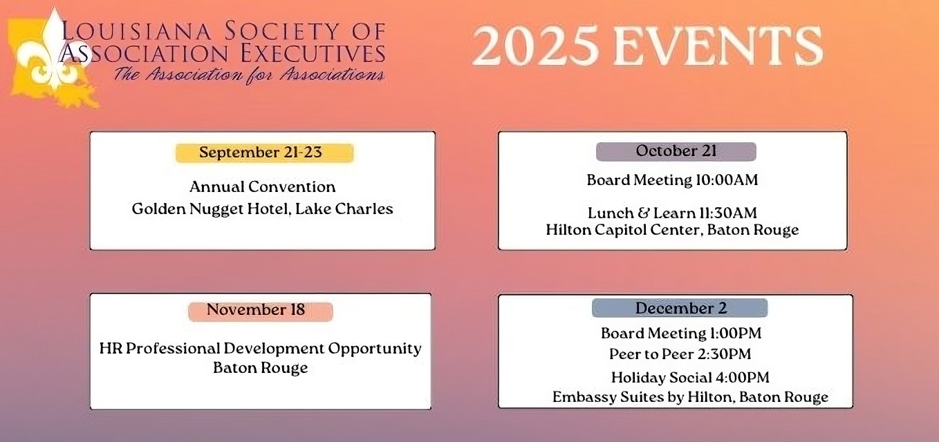 Don't miss your chance - the LSAE 2025 Annual Convention starts on Sunday! This is an opportunity for our association teams to join our association partners to be there for each other. Convention highlights include: Master Execution, What is AI, What does it do and how can I use it?, Fraud's Impact on Non-Profits & How to Prevent It, Maximizing Generational & Life Stage Differences in the Workplace, and more!