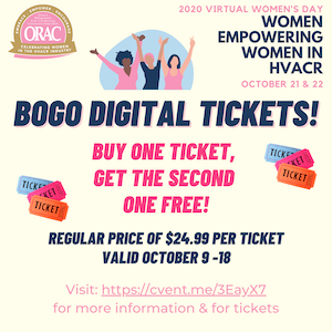 The organizers of the Women Empowering Women in HVACR virtual event are offering a special incentive on tickets to this first-ever forum. Digital tickets, which are normally priced at $24.99 are available in a special buy-one-get-one-free promotion between October 9 and 18!