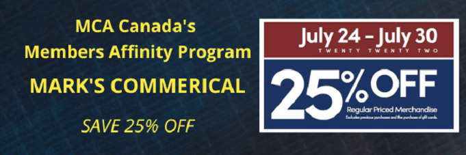 Mark’s Commercial is offering 25% off all MCA Canada Members, but only until July 30.