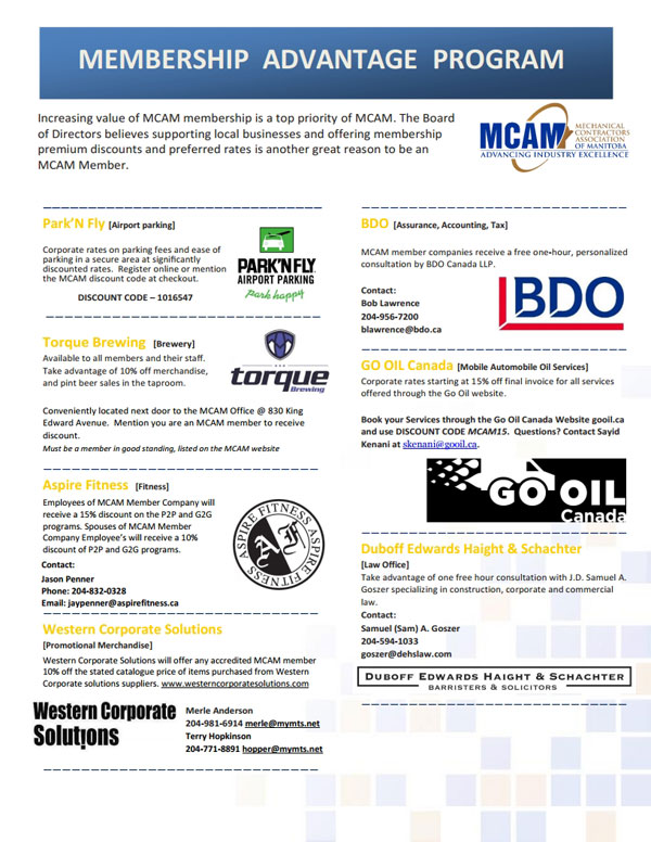The MCAM Board of Directors is always looking for ways to provide additional value for your membership. MCAM is pleased to announce the launch of our Membership Advantage Program! The launch has started off with seven companies, offering you tangible discounts and value! Participating companies are Park N' Fly, Torque Brewing, Western Corporate Solutions, BDO Canada LLP, Aspire Fitness, Go Oil Canada and Attorney Sam Goszer.