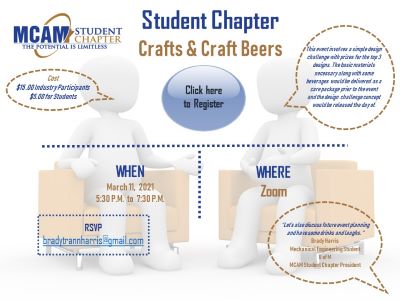 MCAM Student Chapter is hosting Crafts & Craft Beers, an online event. This will be on evening of March 11 and would involve a simple design challenge with prizes for the Top 3 designs.
