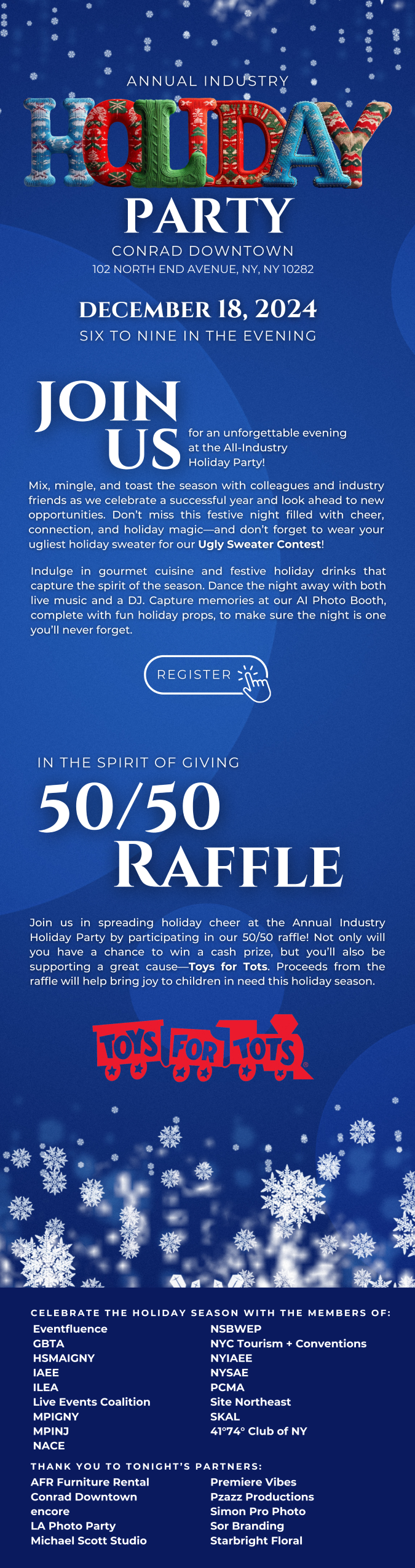 We'll be hosting a 50/50 Raffle at the Industry Holiday Party on December 18, 2024, with proceeds being donated to the U.S. Marine Corps Toys for Tots. This is a wonderful opportunity for us to come together and make a difference in the lives of those in need. The 50/50 Raffle works like this: half the pot goes to the lucky winner, while the other half is donated to Toys for Tots. It's a win-win situation—someone walks away with a cash prize, and we get to spread holiday cheer to children in our community. The mission of the Marine Toys for Tots Foundation is to assist the U. S. Marine Corps in providing a tangible sign of hope to economically disadvantaged children at Christmas. This assistance includes providing day-to-day leadership and oversight of the program, raising funds to provide toys to supplement the collections of local Toys for Tots Chapters, to provide promotional and support material, and defray the costs of conducting annual Toys for Tots Chapters. I encourage all of you to participate in this exciting raffle. Let's make this holiday season extra special by supporting a great cause. Purchase your tickets when you register or purchase at the party. Be sure to bring cash if purchasing on site and get ready to feel the holiday spirit!