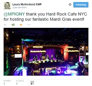 I want to thank everyone who came out to the Mardi Gras networking at the Hard Rock Times Square. The networking team, led by Laura Mulholland, coupled with the Hard Rock, did an outstanding job. Kudos and a sincere heartfelt thank you to all. See you on March 11 for our next After Six Mix! – Carvie Gillikin, President MPI Greater New York.