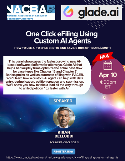 Join us for an exclusive NACBA Member Benefit Webinar featuring glad.ai the fastest-growing AI platform for bankruptcy attorneys! Learn how custom AI agents can streamline your practice—handling data entry, deduplication, petition creation and PACER eFiling 10x faster.