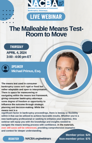 Description: The means test used in consumer bankruptcy cases isn't rigid or fixed but rather adaptable and open to interpretation. There is space for maneuvering or navigating within the means test framework, giving consumer bankruptcy attorneys some degree of freedom or opportunity to influence the outcome through strategic planning and decision-making. While the means test is a significant factor in bankruptcy proceedings, there is leeway or flexibility within it that can be utilized to achieve favorable results. Whether you're a new bankruptcy professional or seeking to enhance your expertise, this webinar will equip you with the knowledge and insights needed to navigate the means testing process with confidence. In the materials, over 140 cases will be referenced, providing comprehensive examples and context for deeper understanding.