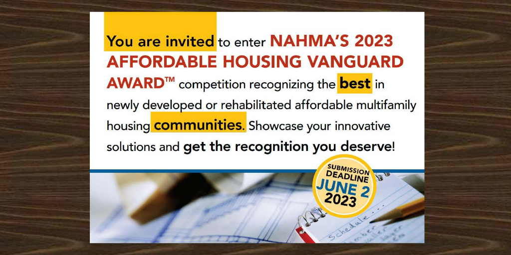 To register, visit, https://naahq.zoom.us/webinar/register/WN_jAzEOOYAQUqYoS23hQx24Q#/registration For registration questions, contact Chris Mahoney at the NAAEI, cmahoney@naahq.org. The deadline for nominating a property for one of NAHMA’s 2023 Affordable Housing Vanguard Awards is fast approaching. The deadline is June 2, and the application can be downloaded from the Vanguard Award webpage. The Vanguard Award recognizes new, quality multifamily affordable housing development and major rehab. The award pays tribute to developers of high-quality, affordable housing; demonstrates that exceptional new affordable housing is available across the country; reflects the creativity and innovation that must be present to create superior properties given the financing and other development challenges; highlights results of private-public partnerships required to develop today’s affordable housing; and shares ideas for unique design and financing mechanisms with industry practitioners to further stimulate creative development in the affordable multifamily industry. Your community could be one of NAHMA’s next Vanguard winners. Start working on your application today. The Affordable Housing Vanguard Awards winners will be recognized at an awards ceremony at the NAHMA fall meeting in October 2023 in Washington, D.C.