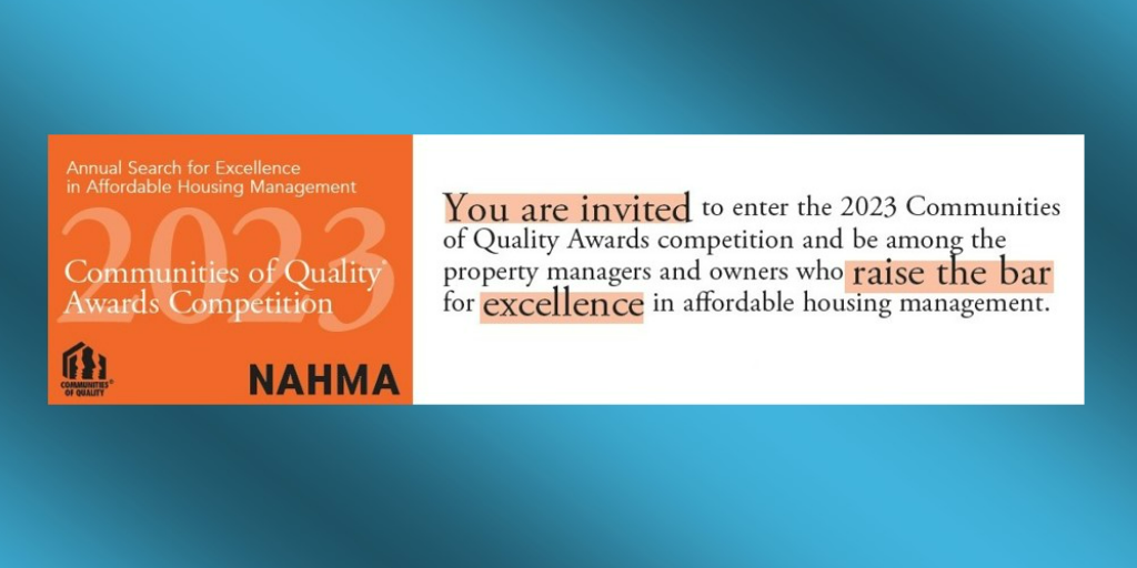 More than 10,000 affordable apartments are being preserved thanks to a $1.2 billion acquisition. The Community Development Trust (CDT), The Michaels Organization, and Goldman Sachs Urban Investment Group acquired 90 affordable housing communities. CDT now has more than 22,000 units under management. To read the entire statement, visit www.naahq.org/joint-venture-preserves-10000-affordable-apartment-homes. From December 2022 to February 2023, the National Apartment Association (NAA) commissioned ndp | analytics to conduct interviews with housing providers and developers from three different markets affected by rent control policies and proposals: St. Paul, Minn.; Santa Ana/Santa Barbara, Calif.; and Portland/Eugene, Ore. The housing provider research was supplemented with an online public opinion poll across the U.S. in February 2023. The top 10 insights are available by visiting www.naahq.org/10-things-americans-really-think-about-rent-control-housing-affordability. ![]() Now is the time to start thinking about your entry for the NAHMA 2023 Communities of Quality (COQ) Awards competition. The awards competition application deadline to NAHMA is Nov. 2. The COQ Awards recognize outstanding property management companies providing the highest quality of safe, affordable multifamily rental housing in communities nationwide. A property must first apply for and achieve national recognition as an NAHMA Community of Quality with a minimum score of 325 points on its National Recognition application to be eligible for the awards competition. The deadline for submitting a COQ National Recognition application to a local AHMA for consideration in the national program is Sept. 7. If a property initially received less than 325 points when its COQ National Recognition application was first submitted, it may elect to update the original application to earn more points if improvements have since been made. Detailed instructions for updating the initial COQ National Recognition application are included in the COQ Awards application brochure. This year’s COQ Awards program is jointly sponsored by Navigate Affordable Housing Partners, a nonprofit engaged in developing, owning, and managing affordable housing, and also a federal contractor providing compliance and financial services on behalf of the Department of Housing and Urban Development (HUD) as the Section 8 Performance-Based Contract Administrator (PBCA) for multiple states; and Yardi, which develops and supports industry-leading compliance, accounting and property management software for every type and size of affordable housing provider. Award winners will be notified in early January 2024. They will receive their awards in a special ceremony at the NAHMA Biannual Top Issues in Affordable Housing Winter Conference, March 6-8, 2024, in Washington, D.C.