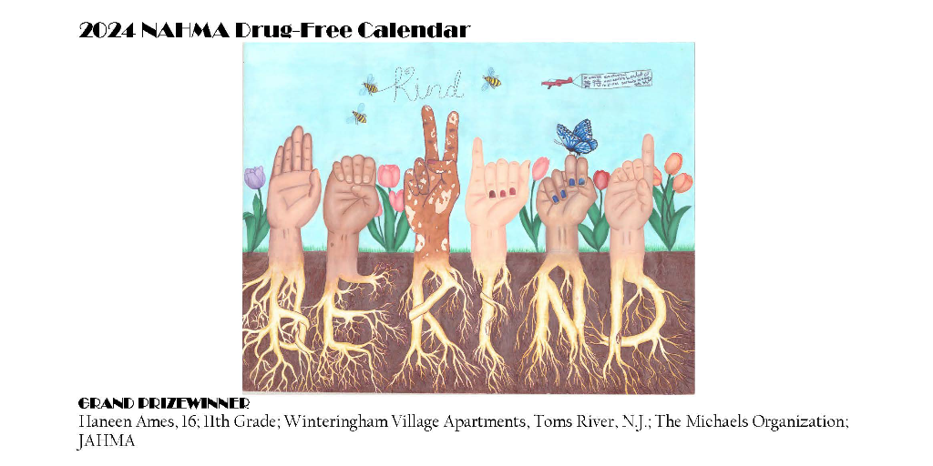 The 2024 NAHMA Drug-Free Kids Calendar makes great gifts or fun resident and staff giveaways. Avoid shipping delays by downloading the order form and sending it in today. The calendars cost $5.50 each, which is a Department of Housing and Urban Development and U.S. Department of Agriculture allowable project expense. There is a small shipping and handling fee for each calendar. The calendars feature original artwork by children, seniors, and adults with special needs living in affordable multifamily housing. The underlying message for the annual calendar contest is always a drug-free theme. Still, the association wanted to open the door for more avenues of expression, so a subtheme was incorporated into the poster contest. This year’s subtheme is People Helping People: Promote Acts of Kindness.