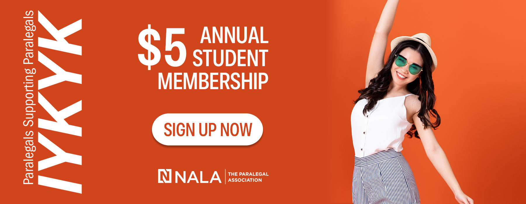 Attention all paralegal students! For a limited time, student membership to NALA is only $5 a year! Get access to the nation's largest association of paralegals, professional development resources, and educational content including a digital subscription to Facts & Findings magazine. Click here to join today!
