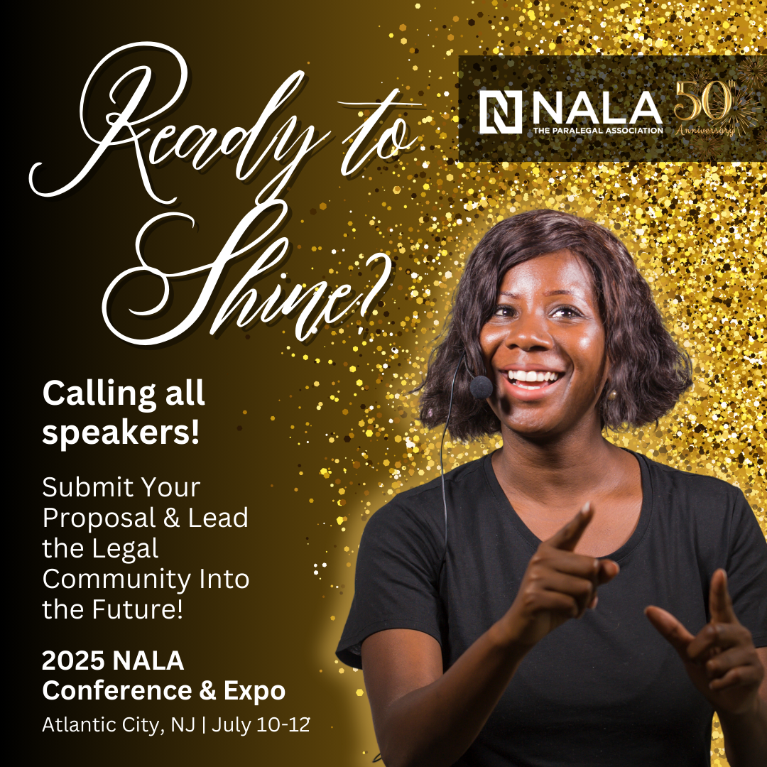 Calling all legal practitioners! Would you like to share your expertise as a speaker at the largest paralegal gathering in the nation? The 2025 NALA Conference & Expo will be in Atlantic City, NJ, July 10-12. The 2025 conference is extra special since NALA will be celebrating our 50th anniversary! Showcase your knowledge and contribute to the professional development of the paralegal community at this iconic milestone event. You can submit session proposals for the 2025 conference through September 1, 2024. Let your experience and training enhance the educational opportunities at conference. In addition to shaping minds and furthering the legal profession, there is the added benefit of having your conference registration and travel costs completely covered, with a sensible per diem thrown in! Don’t miss out on your chance to shine at NALA’s 2025 50th anniversary conference. Learn more and submit your proposal here.