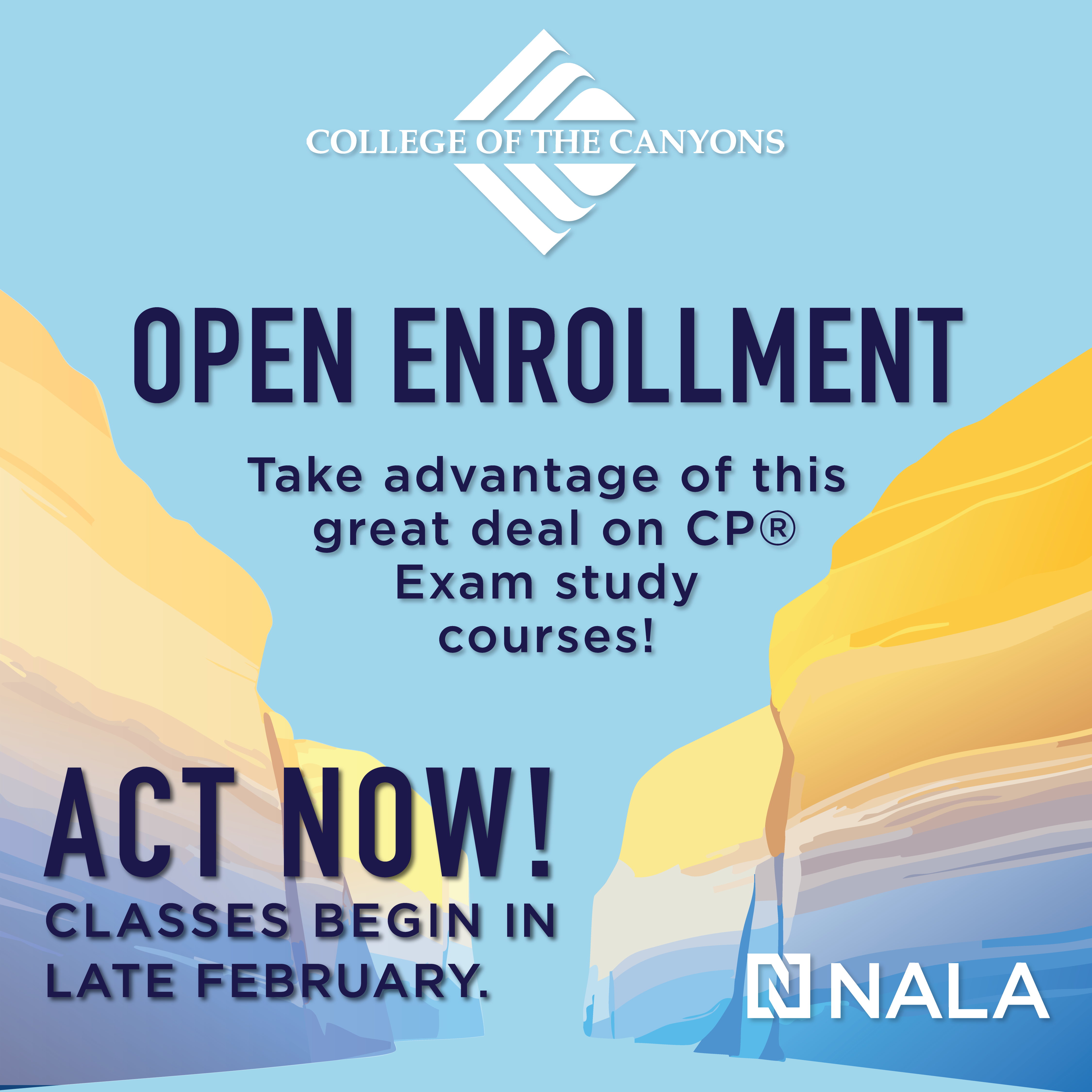 In partnership with NALA, College of the Canyons continues to offer two comprehensive study courses, Knowledge and Skills, to paralegals pursuing certification. The courses are FREE for California residents and have a nominal fee of $75 for non-California residents. Enrollment for the upcoming Certified Paralegal (CP®) Exam study courses is now open, and classes begin in late February. Do not miss out on the chance to benefit from top-tier instruction and guidance provided by experienced legal professionals. For more information on the CP® Exam study courses and enrollment details, please click here (California residents) or here (non-California residents) or email Lori Young.
