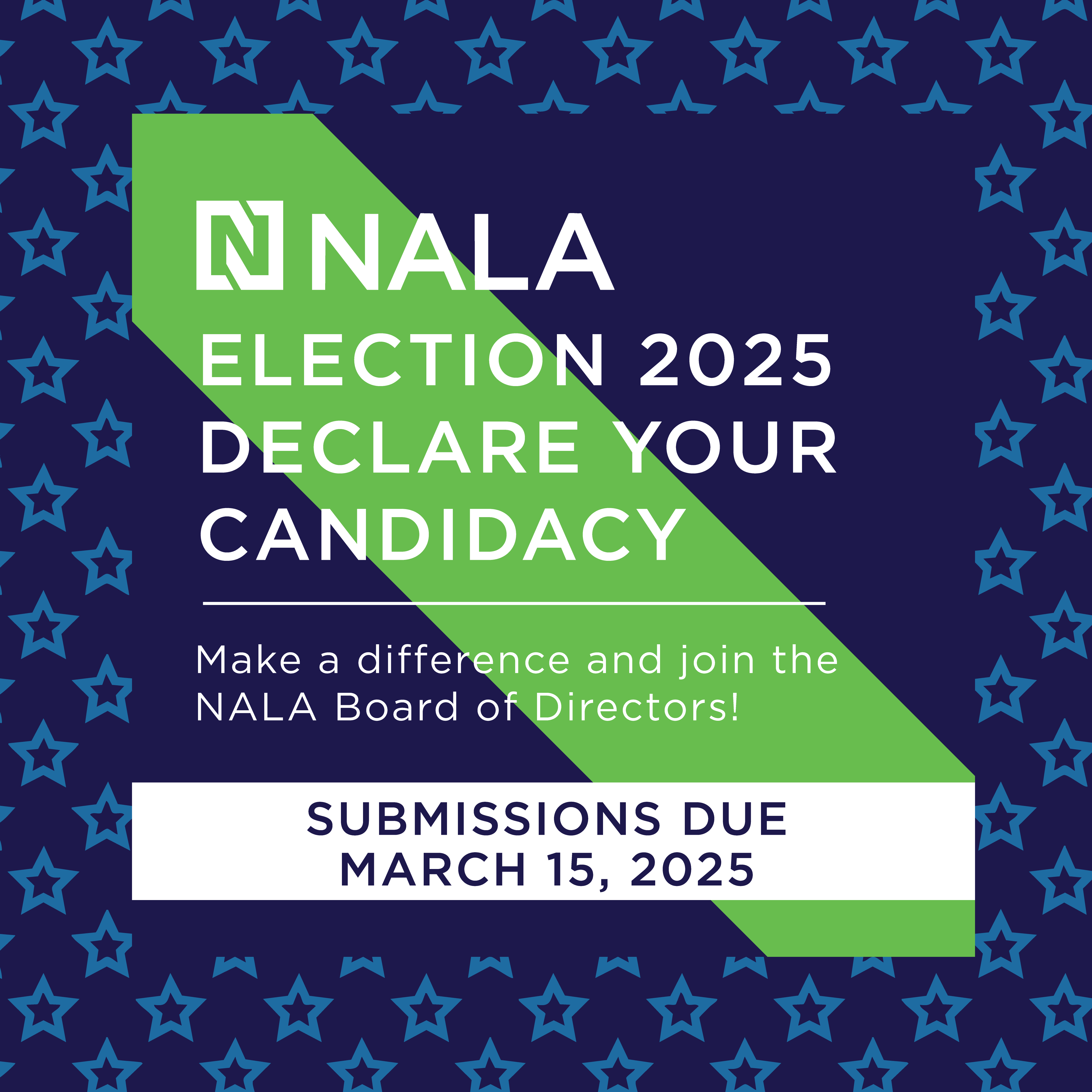 On behalf of the Board, the Talent Acquisition Committee invites qualified members to actively engage with your association. Serving on the Board is a rewarding and fulfilling opportunity to make a meaningful impact. For more information on the various Board positions, click here. Active type members who wish to run for officer or director positions must complete and submit the Declaration of Candidacy packet. NALA Headquarters must receive completed packets no later than March 15, 2025.