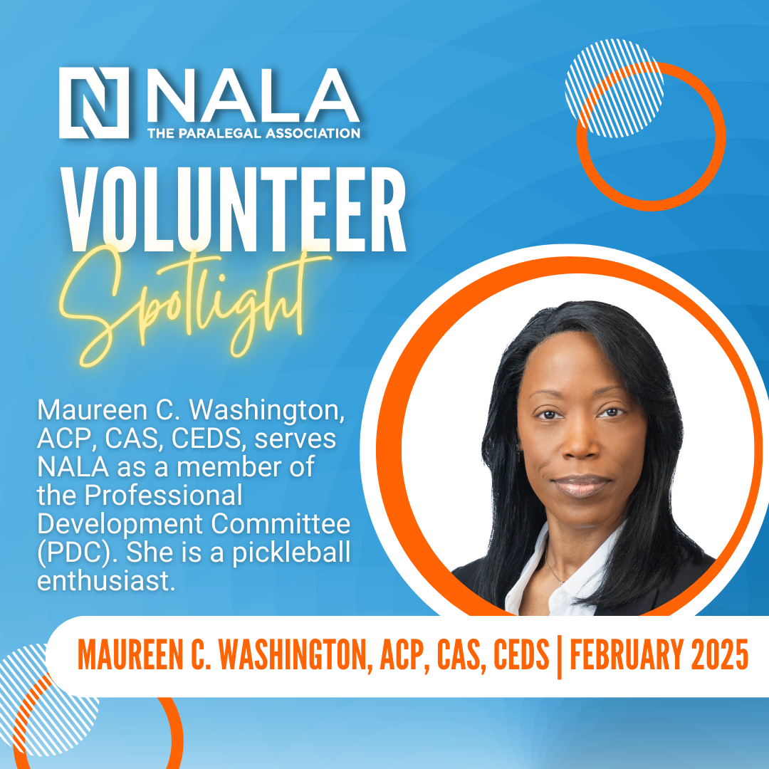 This month’s volunteer spotlight is Maureen C. Washington, ACP, CAS, CEDS, a member of NALA's Professional Development Committee (PDC). Click here to read her spotlight and learn more about her dedication to NALA and the paralegal profession. Try to fill in the blank below, and then find out if you are right by reading her spotlight.