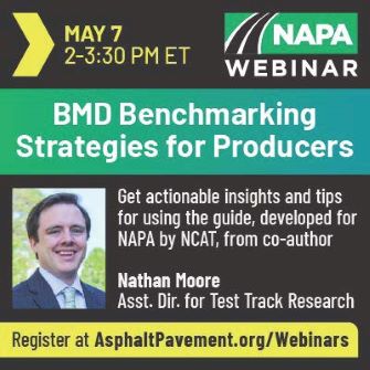 NAPA's Brett Williams and NCAT's Nathan Moore will present actionable insights and tips for using the new Balanced Mix Design (BMD) Benchmarking Guide for producers during a free NAPA webinar on Wednesday, May 7. BMD Benchmarking Strategies for Producers will help asphalt producers understand how to leverage this valuable resource to succeed with BMD implementations in their state or meet the criteria set by their agency if BMD is already implemented. Those who participate will take away practical techniques and strategies to ensure asphalt mixes are designed to meet the desired performance and durability.