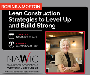 Join us Thursday, November 20th for a virtual webinar featuring Jennifer Lacy, Director of Building Forward & Lean Practices for Robins & Morton. Jennifer will break down Lean Construction's principles: Purpose, Respect, Continuous Improvement -and show you how to apply them to add value to your work and personal life. Don't miss this chance to build smarter!