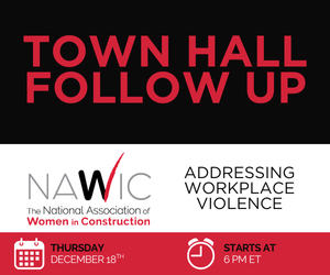 On Friday, November 14, NAWIC held a virtual Emergency Townhall Meeting in response to the murder of tradeswoman Amber Czech. Nearly 300 women in construction and allies joined the call. It is with profound grief, outrage, and unwavering resolve that NAWIC is calling for immediate, systemic action to protect women in the trades. We have compiled a comprehensive information and resource document focused on harassment and workplace violence prevention, mitigation, and response. This document includes valuable resources and information which will be shared during the Town Hall Follow Up.