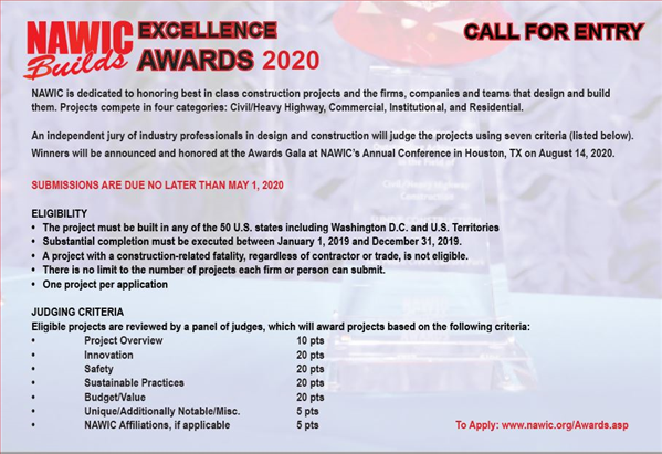 The May 1, 2020 submission deadline for the NAWIC Builds Excellence Awards is quickly approaching. Don't miss out on your chance to showcase your company's EXCELLENCE! ![]() Each year, NAWIC awards three very special individuals with our annual awards: Future Leader, Lifetime Achievement and Member of the Year. Below, find a brief description of each award (nomination forms available on the NAWIC site - just click "Learn More"). Future Leader: Recognizes the outstanding efforts of a new NAWIC member who has been actively involved throughout their first two years. Education / Training