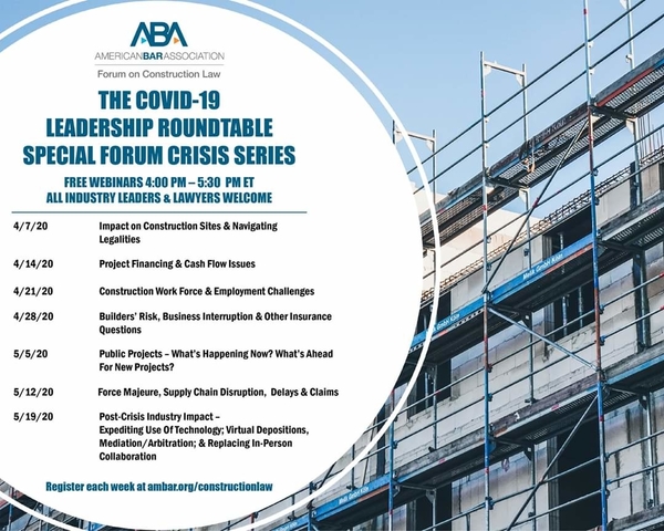 ![]() The American Bar Association Forum on Construction Law (ABACLG) has put together a COVID-19 Leadership Roundtable Special Forum Crisis Series. These free webinars take place at 4 p.m. ET on the dates noted, and all industry leaders and lawyers are welcome! Mark your calendars now! Additionally, recordings of already completed sessions are available on the webinar page of the NAWIC site. ![]()