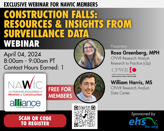 Presenters will discuss the latest Falls Campaign resources, the campaign website redesign, and how to participate in the National Safety Stand-Down to Prevent Falls in Construction. Additionally, new data on fatal and nonfatal falls in construction will be covered to address the most recent trends in the industry. Click the link below to register.