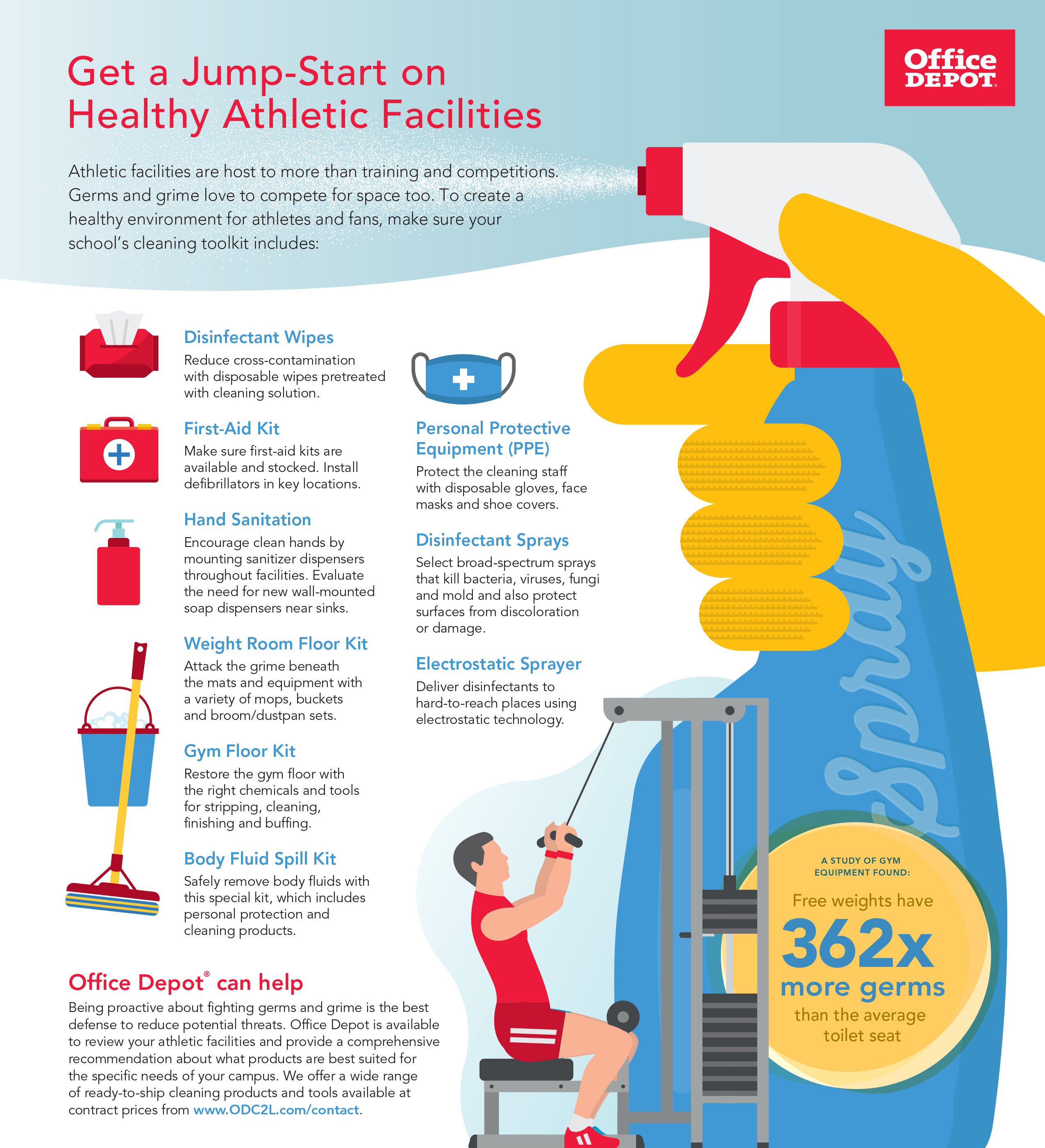 Being proactive about fighting germs and grime is the best defense to reduce potential threats. Office Depot is available to review your athletic facilities and provide a comprehensive recommendation about what products are best suited for the specific needs of your campus. We offer a wide range of ready-to-ship cleaning products and tools available at contract prices. Contact us today.