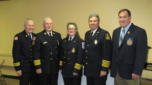 Pictured: New York State Association of Fire Chiefs President Skip Sylvester, 1st Deputy Chief Chaplain Ken Palmer and Chief Chaplain Barrie-Lyn Foster (New York State Association of Fire Chaplains), New York State Association of Fire Chiefs Past President Al Varlaro, and Firemen's Association of the State of New York President David Jacobowitz.