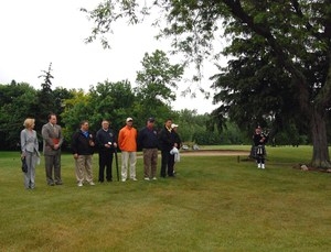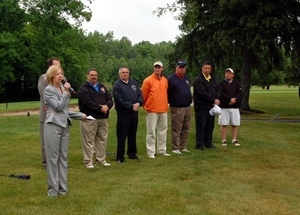 Monroe County Executive Maggie Brooks addresses the golfers at the opening ceremony. Also pictured: Dave Seeley representing Governor Andrew Cuomo, Interim Chief Sam Mitrano of the Rochester Fire Department, Chief Bud Phillips of the Ridge Road Fire District and NYSAFC director, Captain Kevin Sullivan of the Horseheads Fire Department (son of Richard Sullivan), Chief John Tighe of the Corning Fire Department and NYSAFC 1st vice president, Monroe County Legislator Rick Antelli, and Greece Town Councilman Kirk Morris.