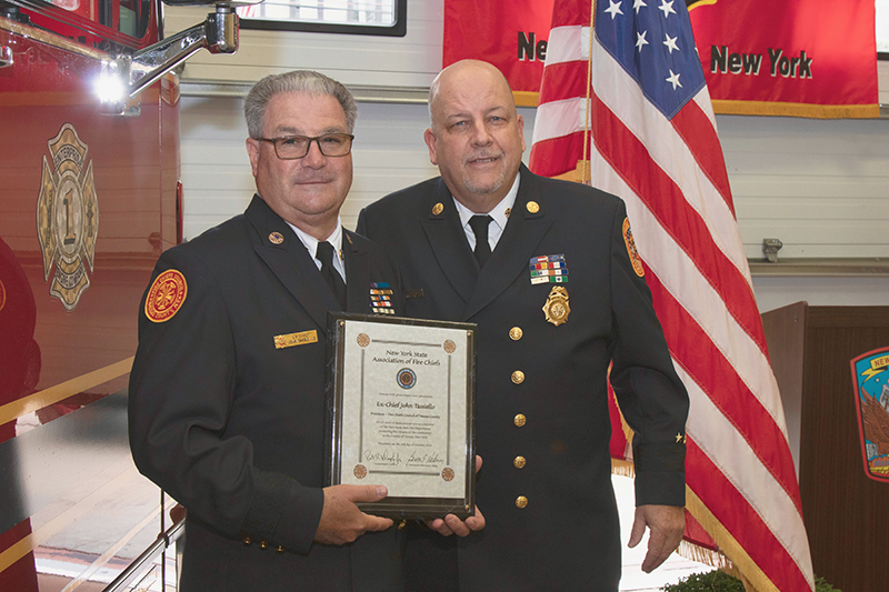 On October 3, 2021, Ex-Chief John Tassiello was honored for 50 years of service as a member of the New Hyde Park Fire Department (Nassau County). NYSAFC President Robert Kloepfer Jr. participated in a ceremony recognizing Tassiello, who currently serves as president of the Fire Chiefs Council of Nassau County. He has been a member of NYSAFC since 2011.