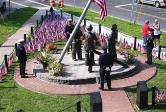 The annual vigil consists of three ceremonies to allow for everyone in the community the opportunity to attend at least one. Each year at the opening ceremony, the grand 6-foot-by-10-foot American flag is lowered to half-staff. At 8:47, the next tradition that has set in over time takes place. The fire department rings the memorial bell in true FDNY fashion. The bell tolls 5-5-5-5, as it always has when a firefighter is killed in the line of duty in New York City. Throughout the day, people visited the memorial. Some dropped flowers, while others stopped to offer a prayer. People shared a thank you with their community volunteers. The vigil also included a mid-day ceremony at noon and dignified closing ceremony at 7:30 p.m.