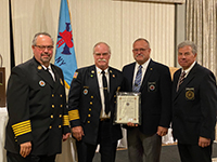 Representatives of NYSAFC were on hand for a celebration recognizing Past President Daniel Schwertfeger for his service with the Floyd Fire Department. Pictured: NYSAFC Director William Owen III, Daniel Schwertfeger, CEO Bruce Heberer, and Past President Alfonso Varlaro.