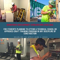 The AGC Education and Research Foundation offers Workforce Development Scholarships to students enrolled in accredited technical schools or craft training programs in any discipline of commercial construction. Students in technical or approved craft training programs will have until June 1st to apply for $1,000 scholarships (renewal for up to two years) from the AGC Education and Research Foundation.