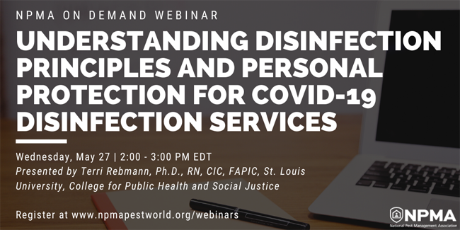 Join Dr. Terri Rebmann a board-certified infectious disease expert on properly disinfecting surfaces for COVID 19, as well as implementing safety protocols. During this webinar she will address how to disinfect and sanitize surfaces appropriately from an infectious disease perspective. You will also learn about specific risks that pest management professionals may run into during routine work and how to protect employee’s health and safety in a variety of pest management positions.
